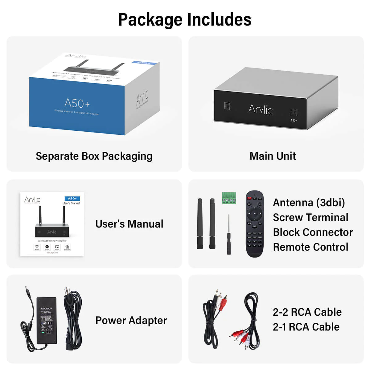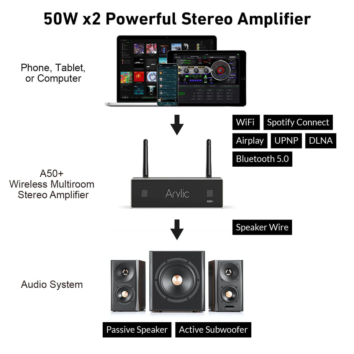 Arylic A50+ – найкращий домашній бездротовий стереопідсилювач для пасивних динаміків, щоб керувати музикою за допомогою Wi-Fi, AirPlay або Bluetooth 5.0 у будь-якій кімнаті для прослуховування в кількох кімнатах.