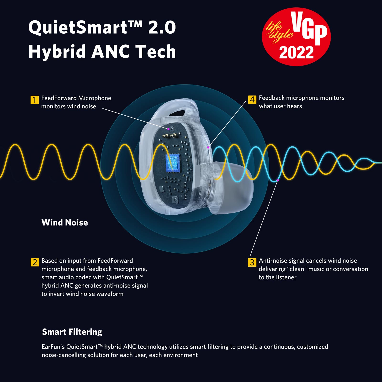 Також важливою особливістю навушників є автоматичне визначення шуму вітру та зниження його впливу. Технологія гібридного шумозаглушення QuietSmart 2.0 забезпечує придушення шуму до 40 дБ. Тобто, шум не відволікатиме і не заважатиме прослуховуванню музики або дзвінкам навіть у галасливій обстановці. Кожен навушник має 3 мікрофони, 2 з яких задіяні для ефективного шумозаглушення та один для дзвінків. Останній повністю оптимізований для уловлювання голосу.