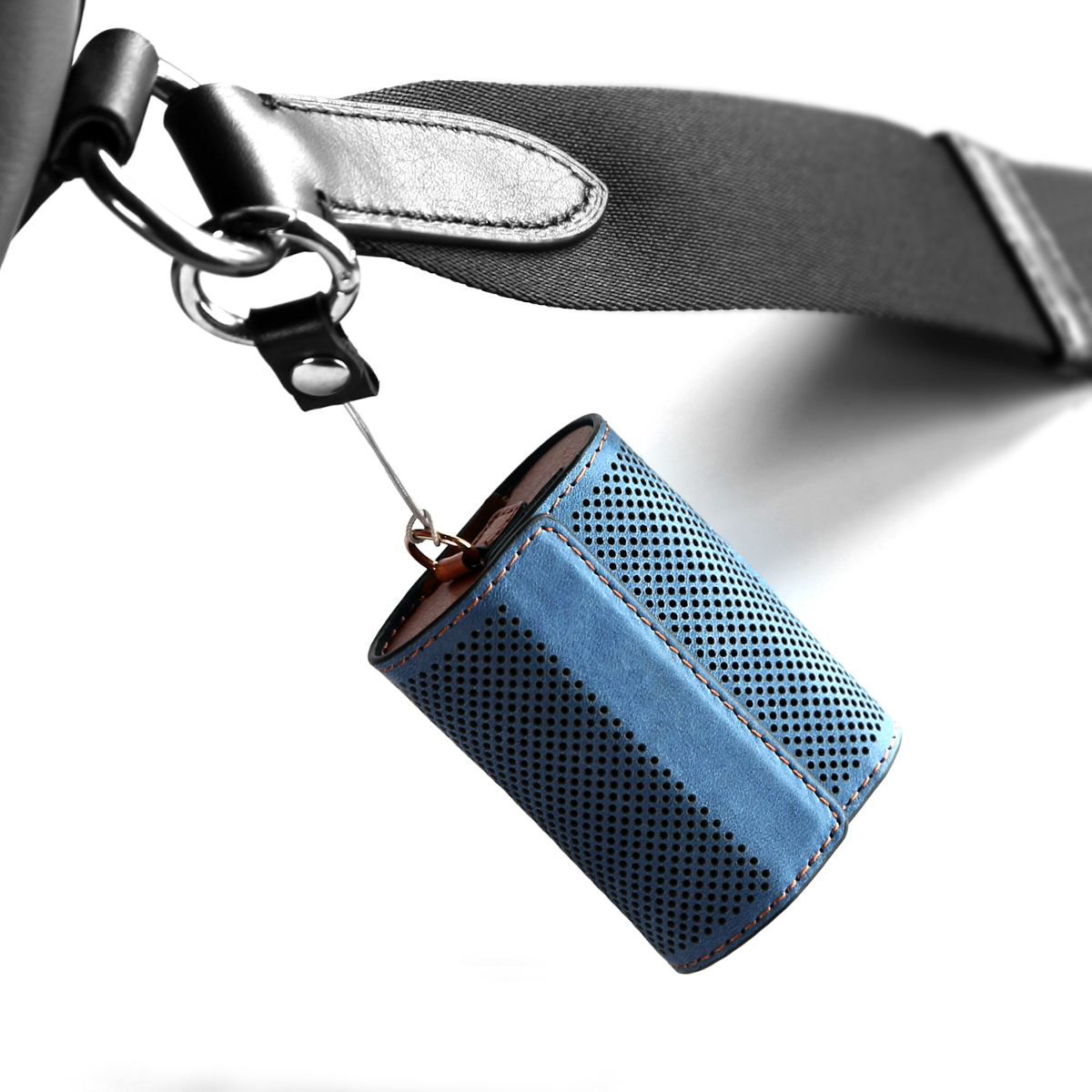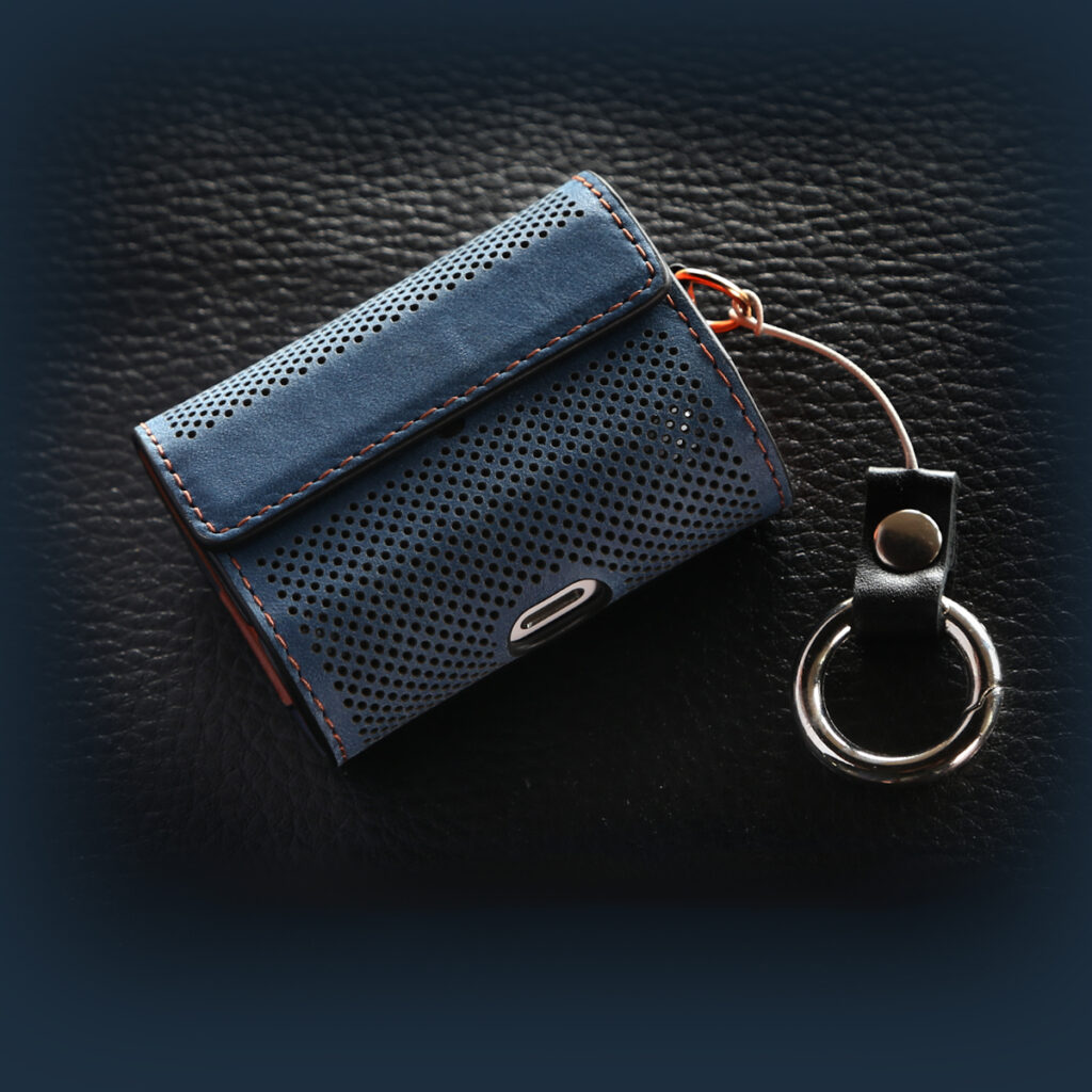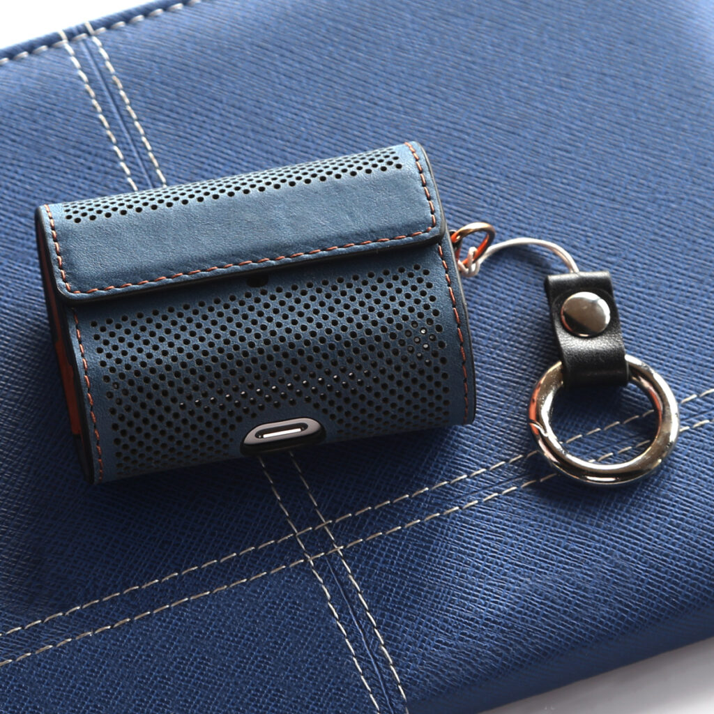 Відкидна частина легко відкривається і так само просто закриває чохол за допомогою вбудованого магніту. Чітко підігнана форма чохла добре утримує навушники всередині. Виїмка на передній частині акуратно огинає індикатор живлення так, що легко стежити за його станом. На бічній частині чохла розмістилося кріплення у вигляді кільця. Таким чином ви можете носити його як брелок або підвіс.