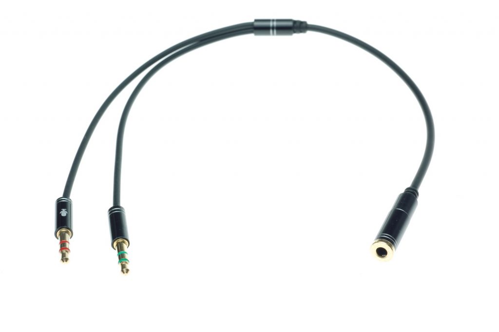 Даний кабель працює як сплітер та розділяє сигнал від гарнітури на два входи — окремо для мікрофону та для навушників.